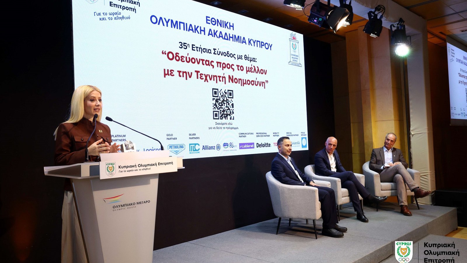 Με ιδιαίτερη επιτυχία πραγματοποιήθηκε την Παρασκευή 5 Δεκεμβρίου, στην ειδικά διαμορφωμένη και κατάμεστη αίθουσα ΟΠΑΠ «Ευ Αγωνίζεσθαι» του Ολυμπιακού Μεγάρου, η 35η Σύνοδος της Εθνικής Ολυμπιακής Ακαδημίας Κύπρου (ΕΟΑΚ), αφιερωμένη στο θέμα «Οδεύοντας προς το μέλλον με την Τεχνητή Νοημοσύνη». Η φετινή διοργάνωση επικεντρώθηκε στη στρατηγική σημασία των νέων τεχνολογιών για το μέλλον του Ολυμπισμού και του διεθνούς αθλητισμού.